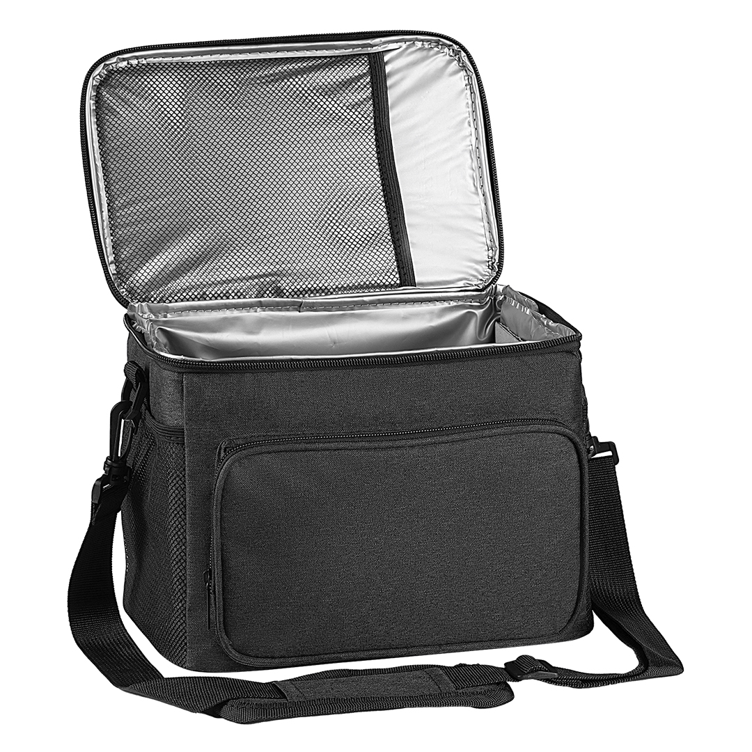 Rashladna torba za hranu i piće • Spoljašnji materijal: dvo-tonski tekstil • Termo postava: PEVA obloga + aluminijumska izolaciona pena • Glavni odeljak sa rajsferšlusom • Prednji džep sa rajsferšlusom • Dva bočna mrežasta džepa • Podesivi rameni kaiš • Kapacitet: 6 limenki (0,5 l) • Pogodna za rashladne uloške